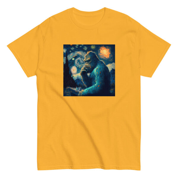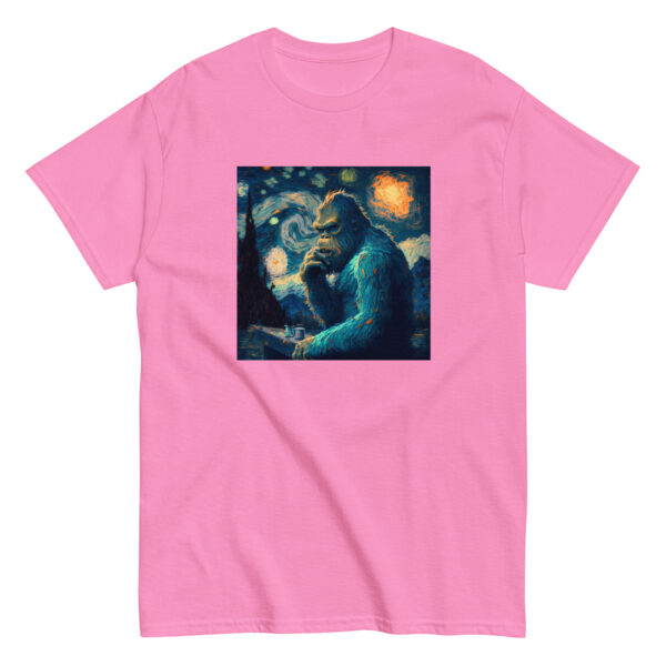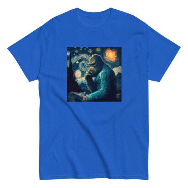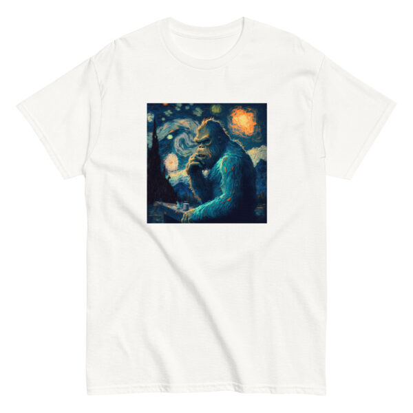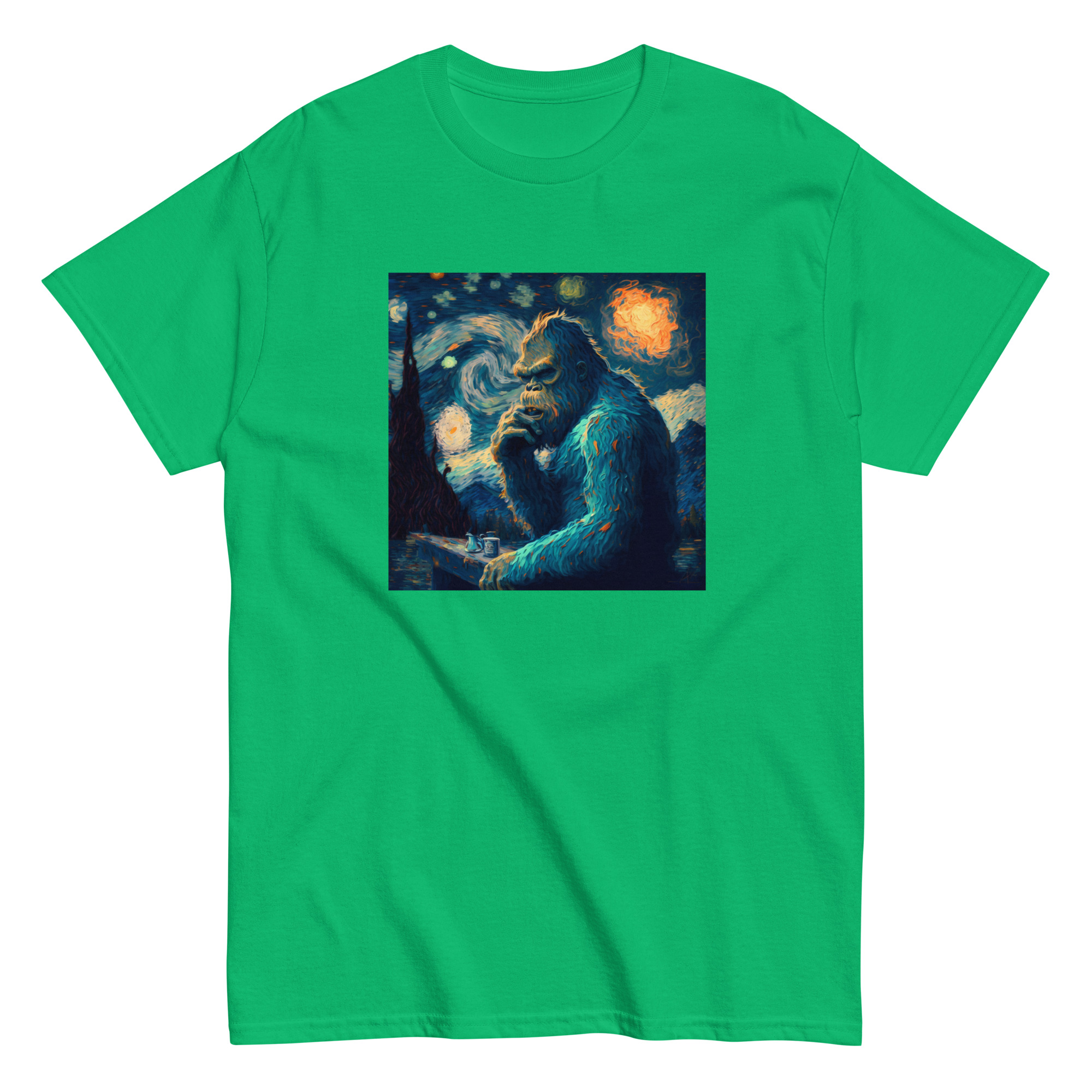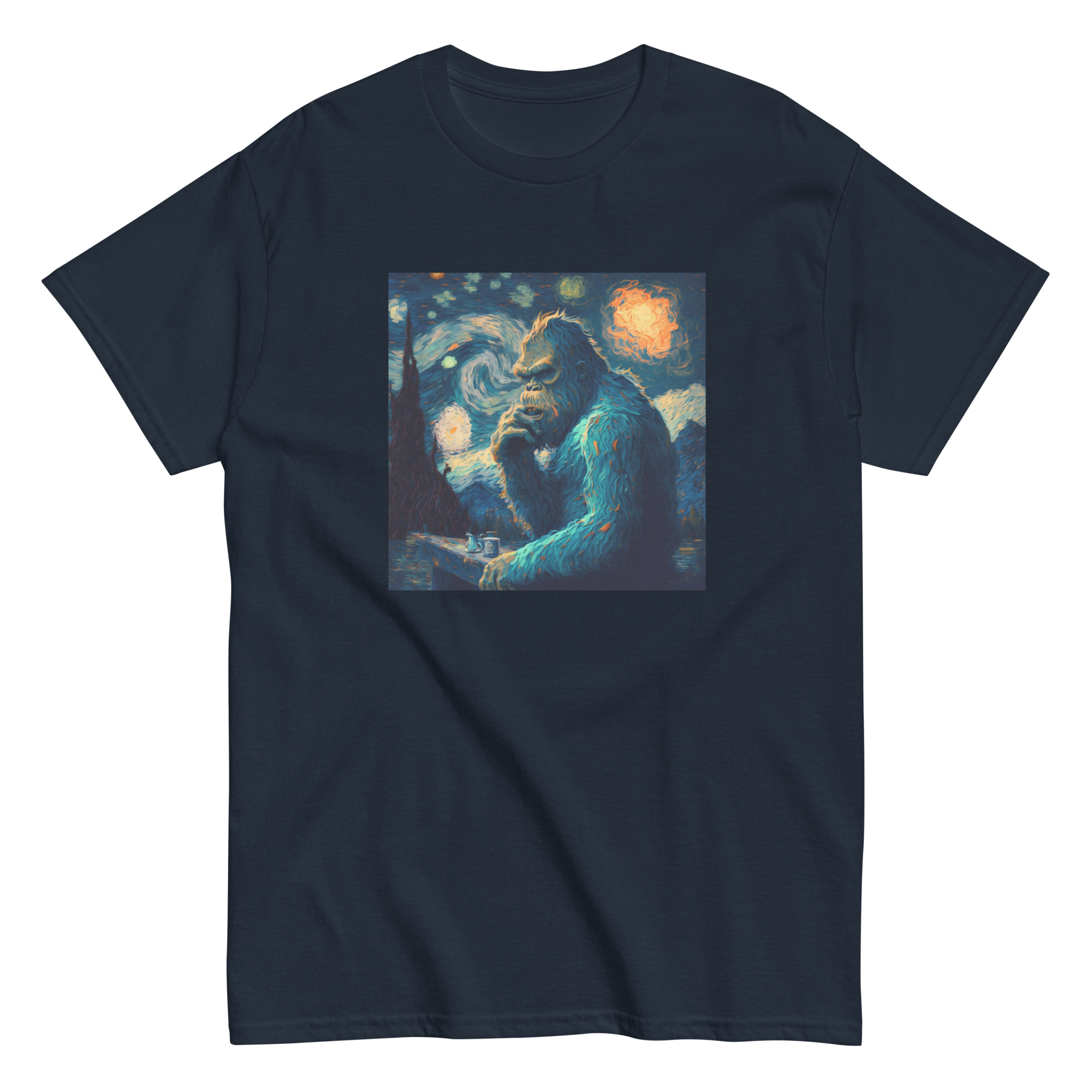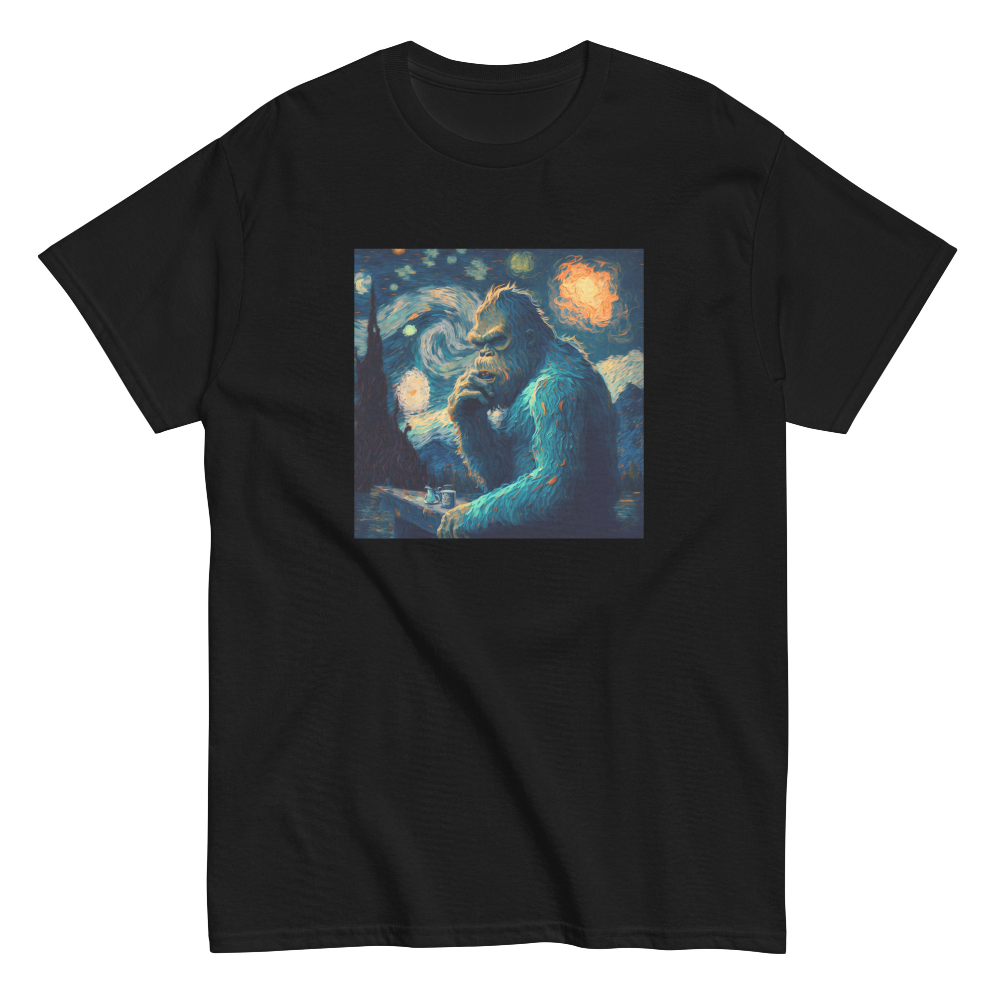 Inspired by Van Gogh, this one-of-a-kind masterpiece, “Bigfoot Starry Night,” blends the mythical with the ethereal. Amidst swirling cosmic skies, Bigfoot emerges as an elusive figure, shrouded in moonlight. The painting’s mysterious aura and vivid colors evoke a sense of wonder. You’ll be sure to want to show this t-shirt off!