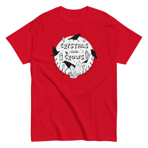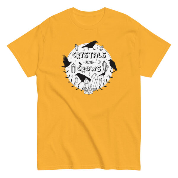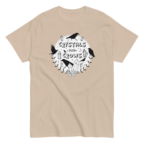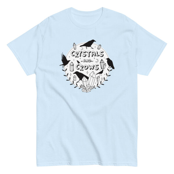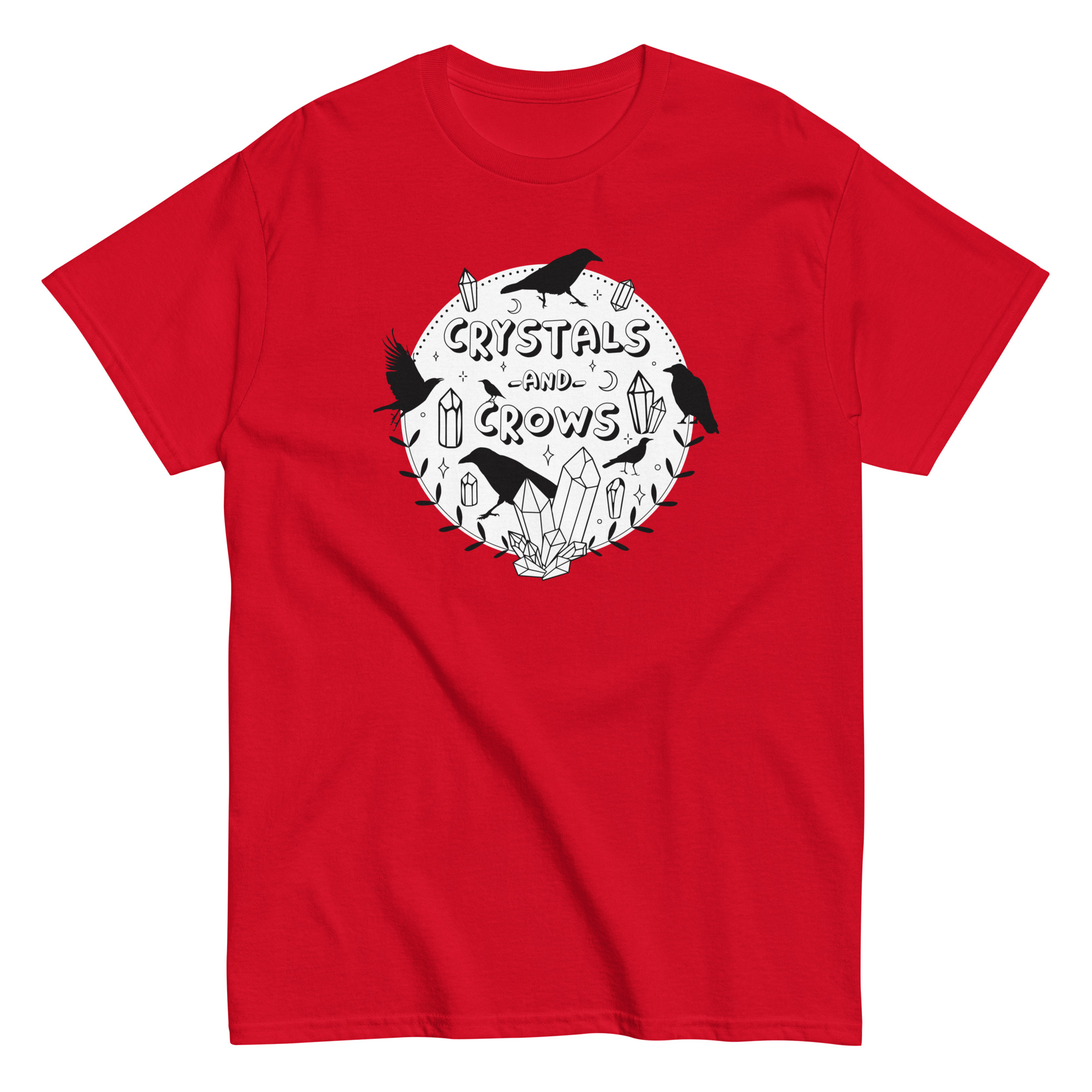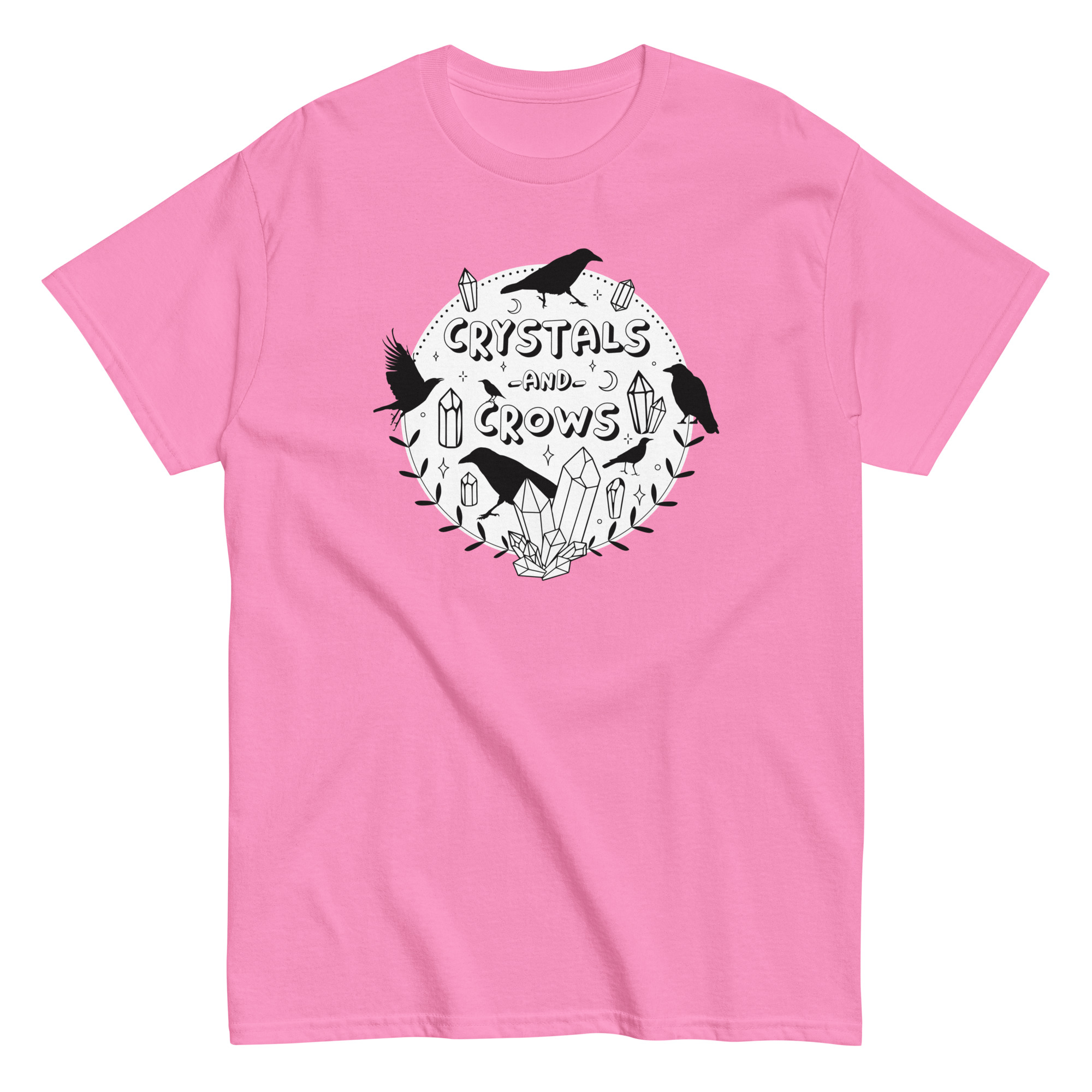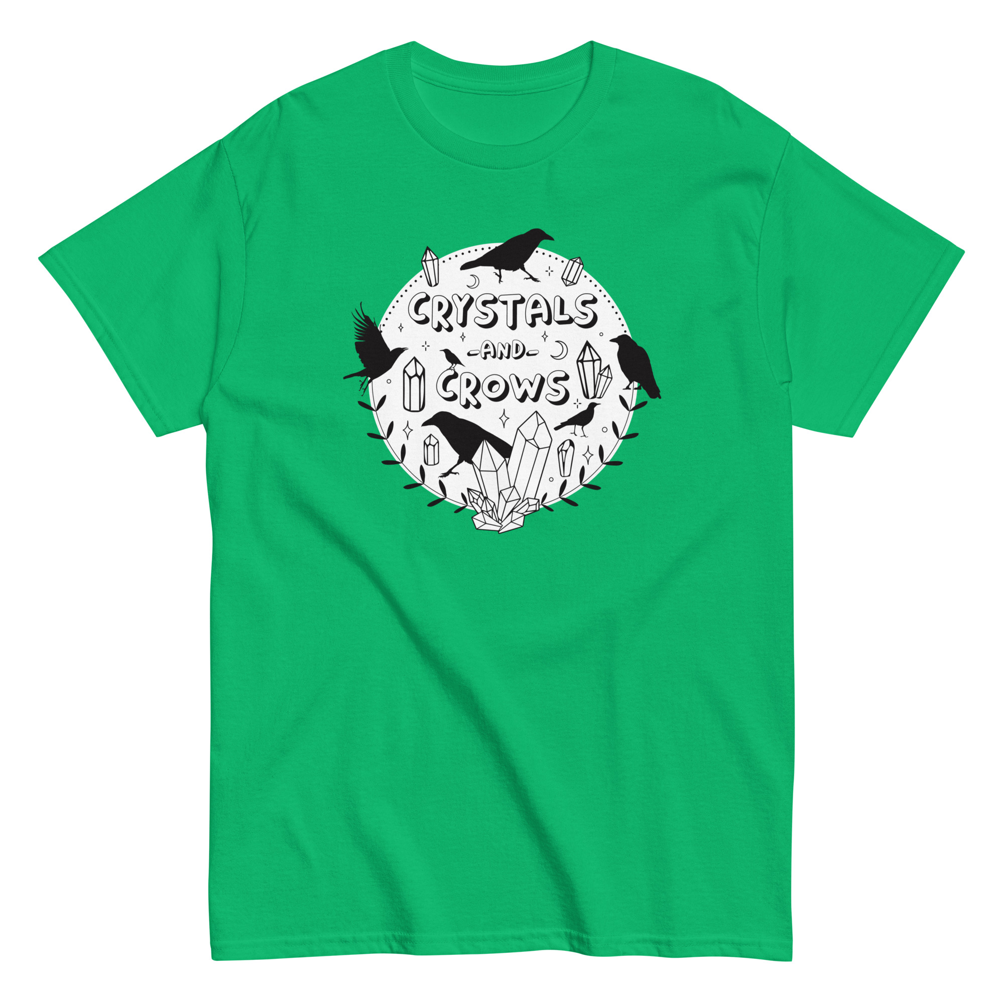 Elevate your style with this unique t-shirt featuring crow motifs and embedded quartz crystals, representing nature’s mystique and beauty. Perfect for a crow lover who enjoys the power of crystal energy!