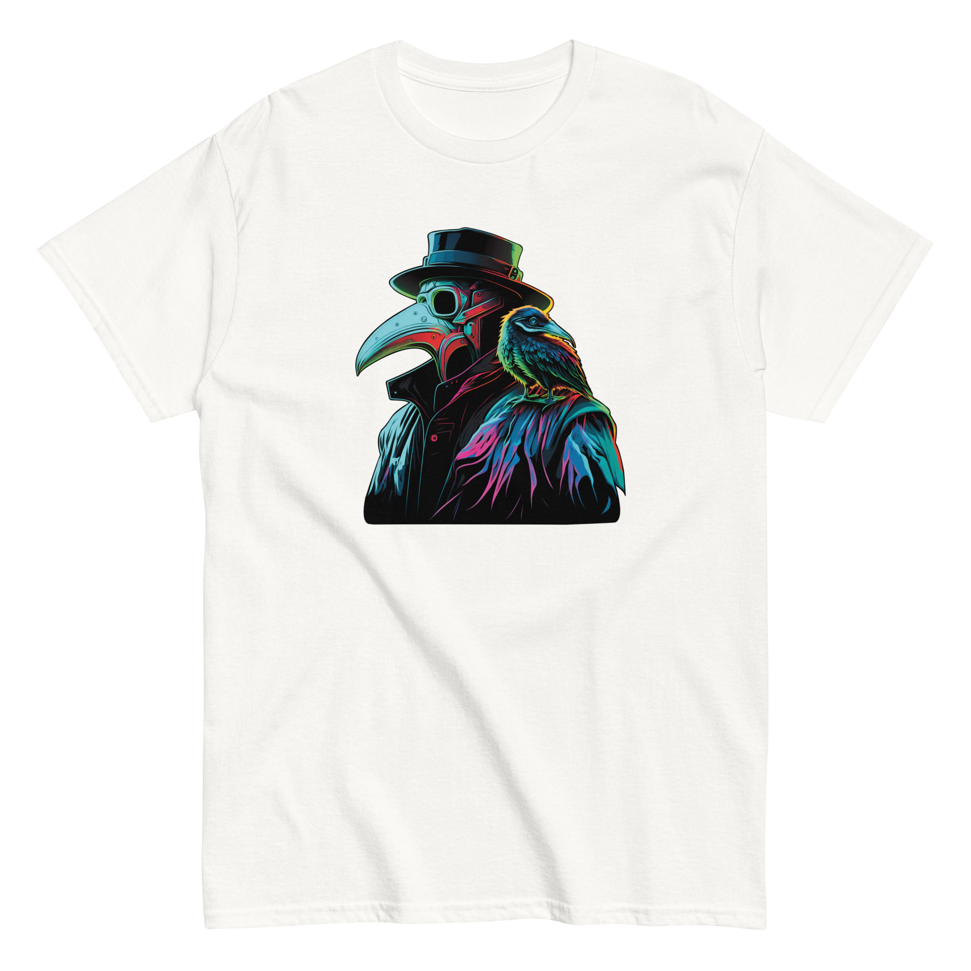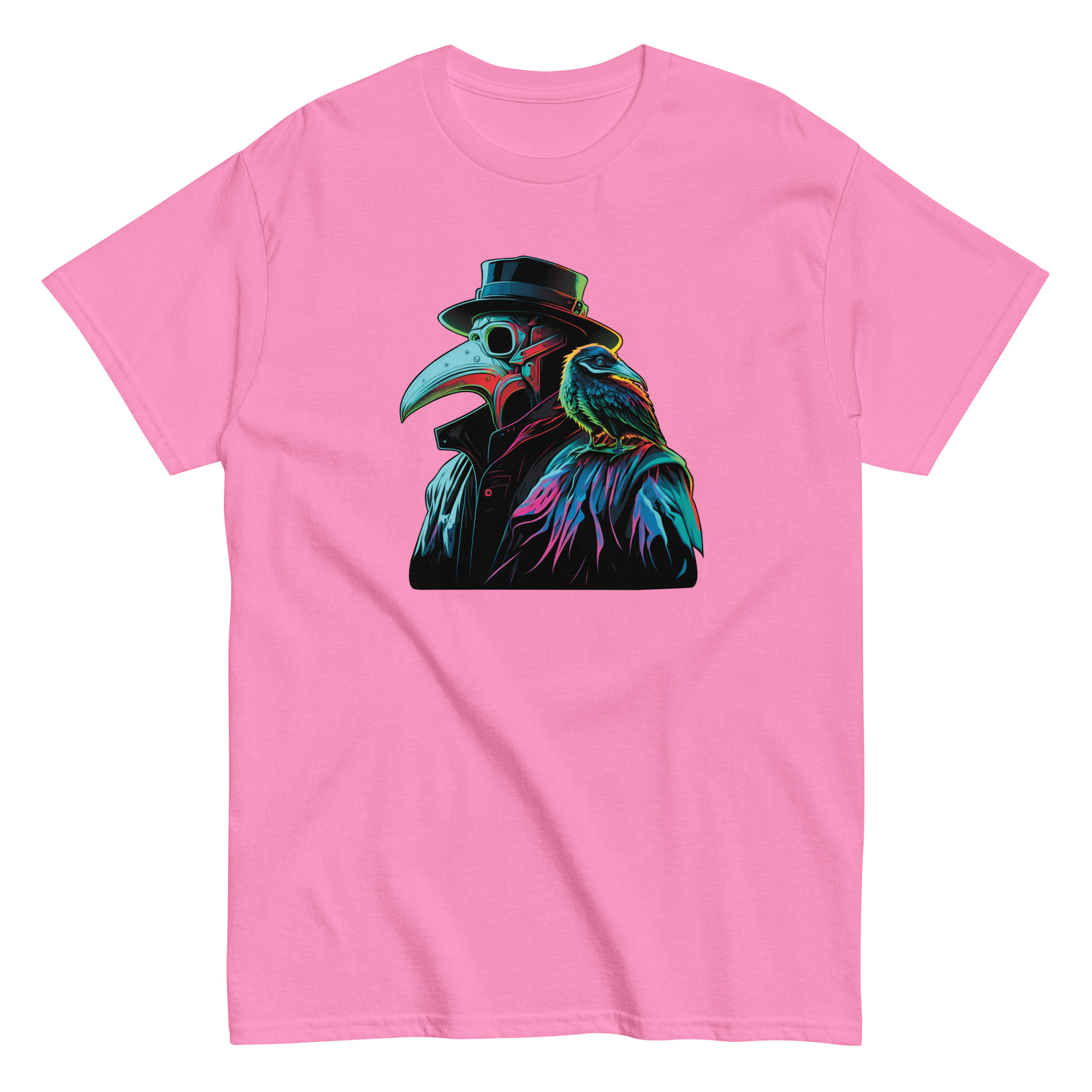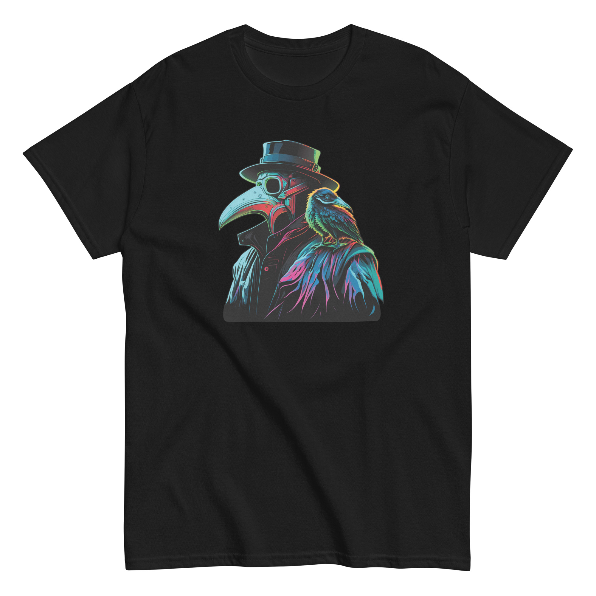 A retro style Plague Doctor and his crow friend. This design is a vivid homage to the colorful vibes and electric energy of the 1980s synthwave scene, transporting you back to a time when music and visuals fused to create a mesmerizing neon dreamscape!