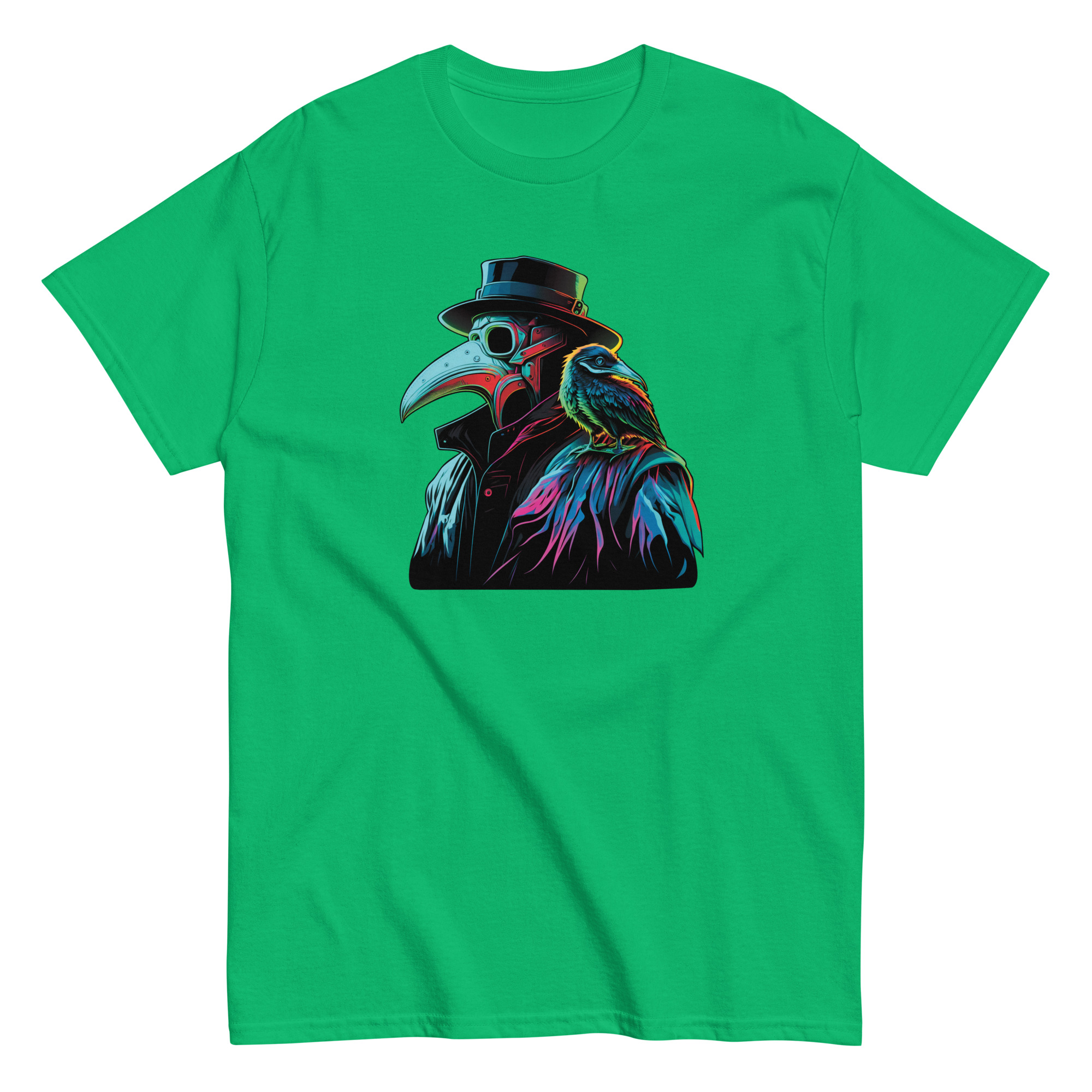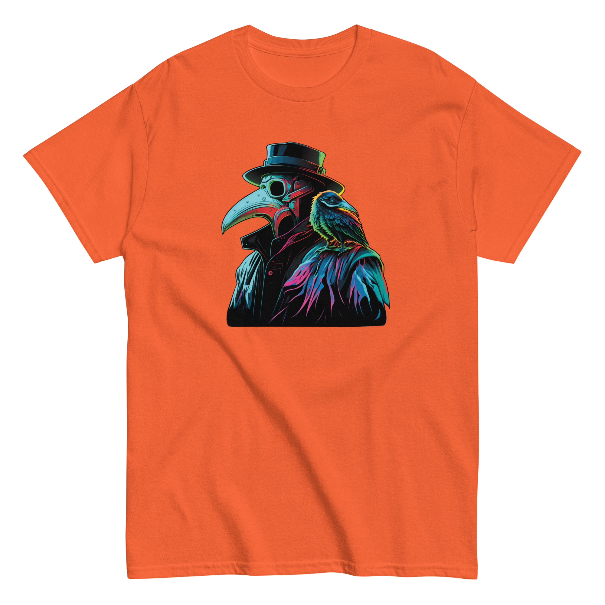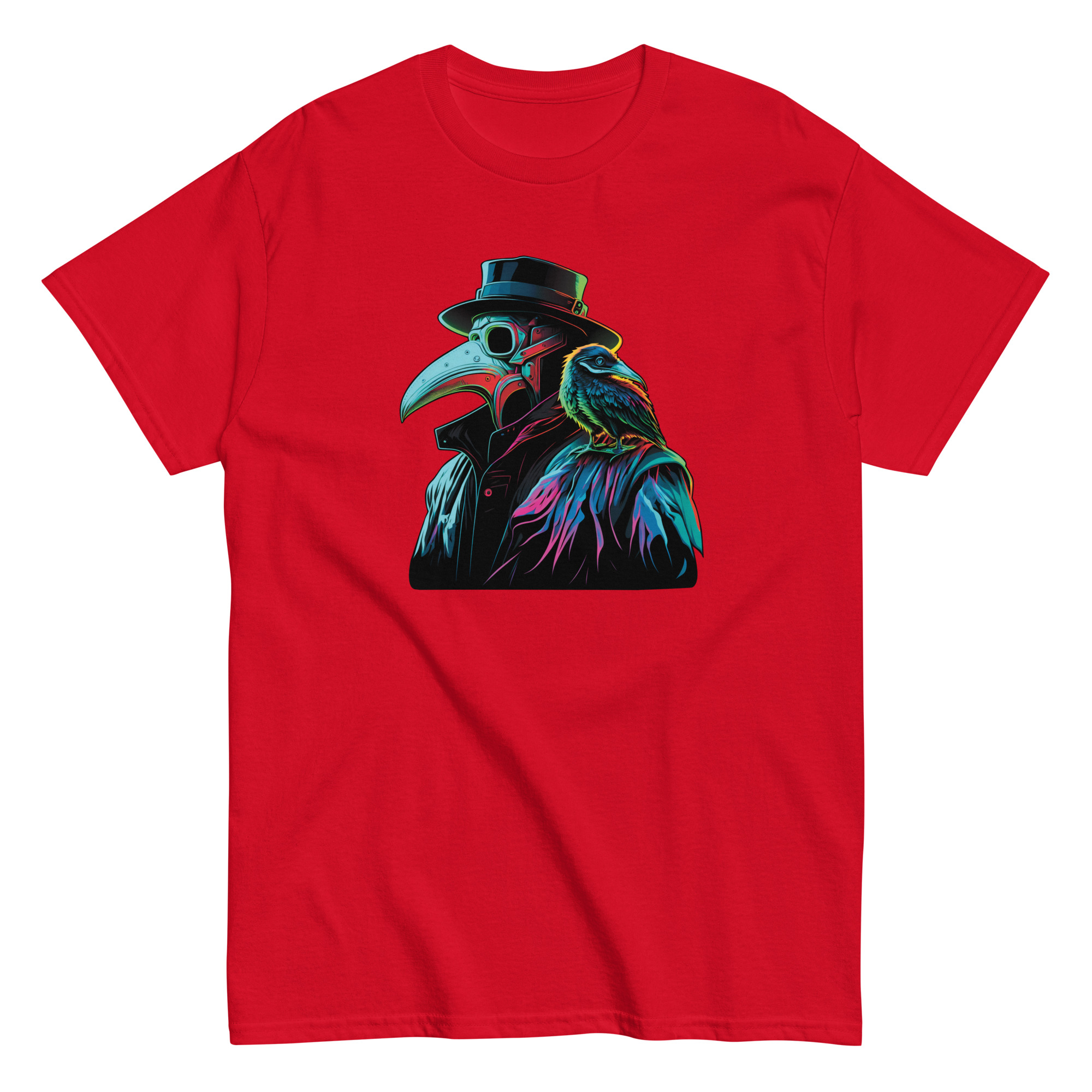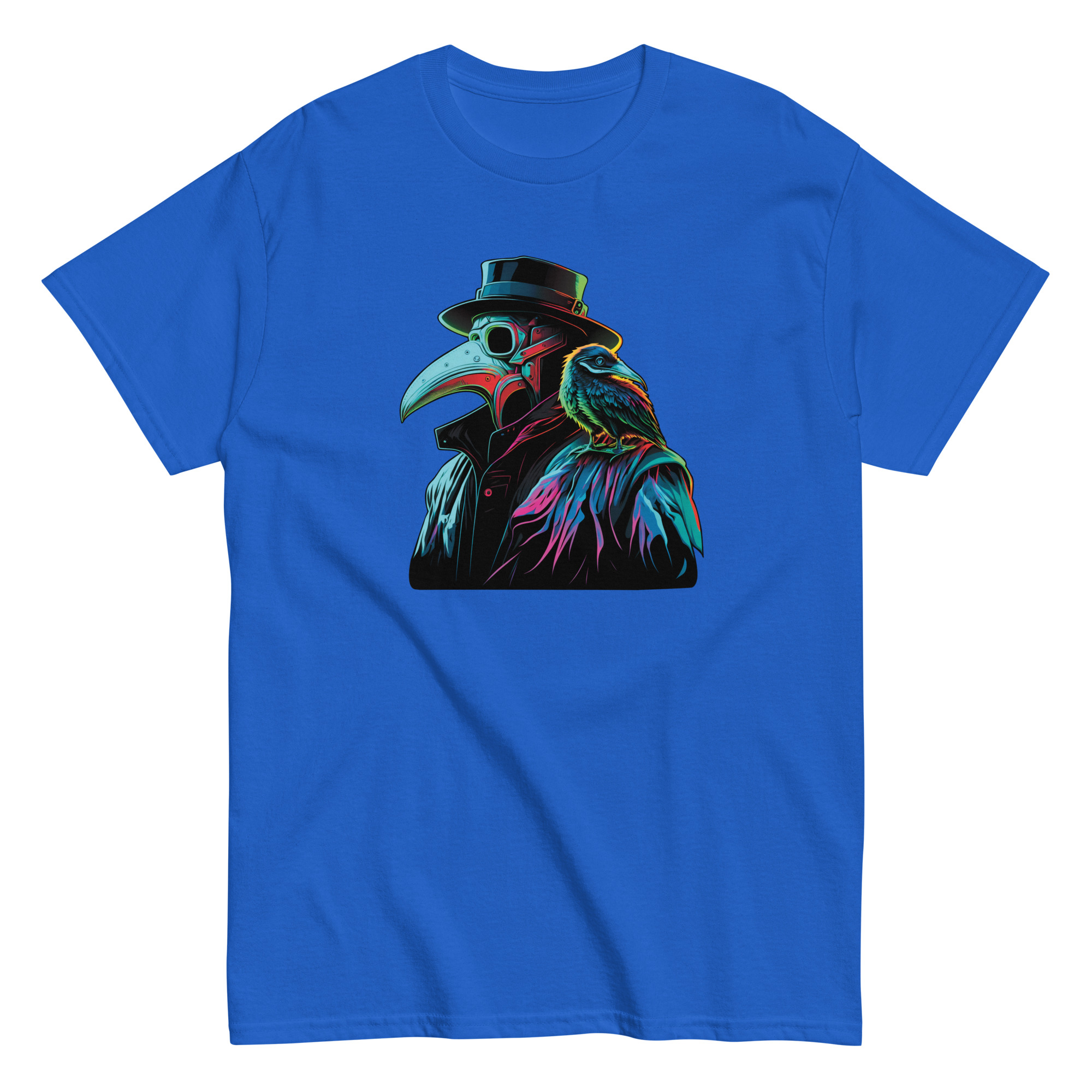 A retro style Plague Doctor and his crow friend. This design is a vivid homage to the colorful vibes and electric energy of the 1980s synthwave scene, transporting you back to a time when music and visuals fused to create a mesmerizing neon dreamscape!