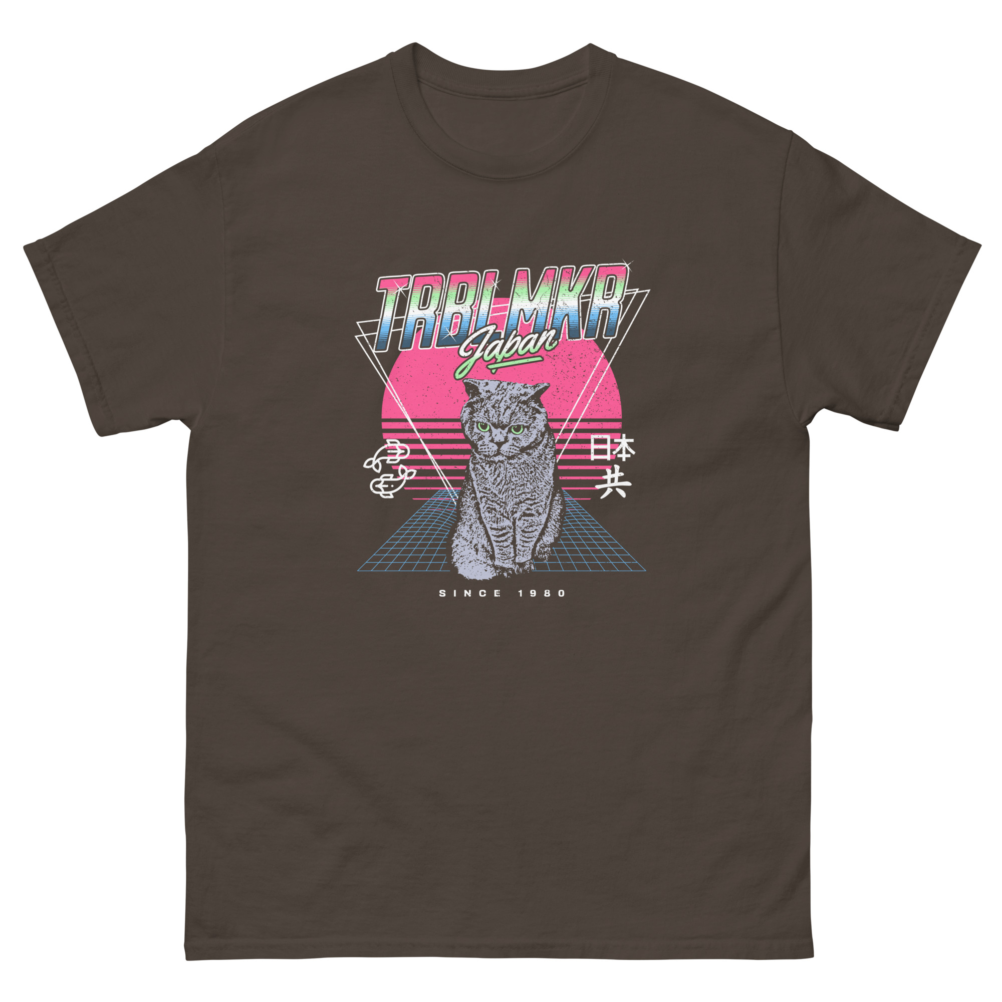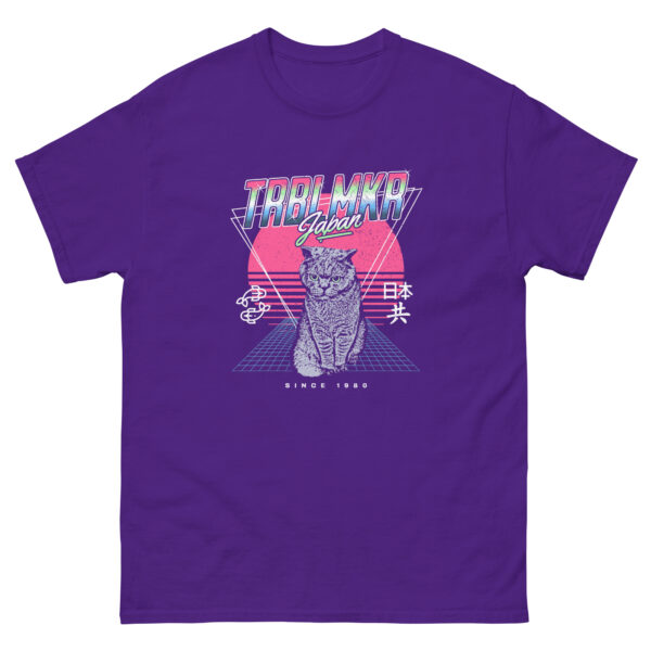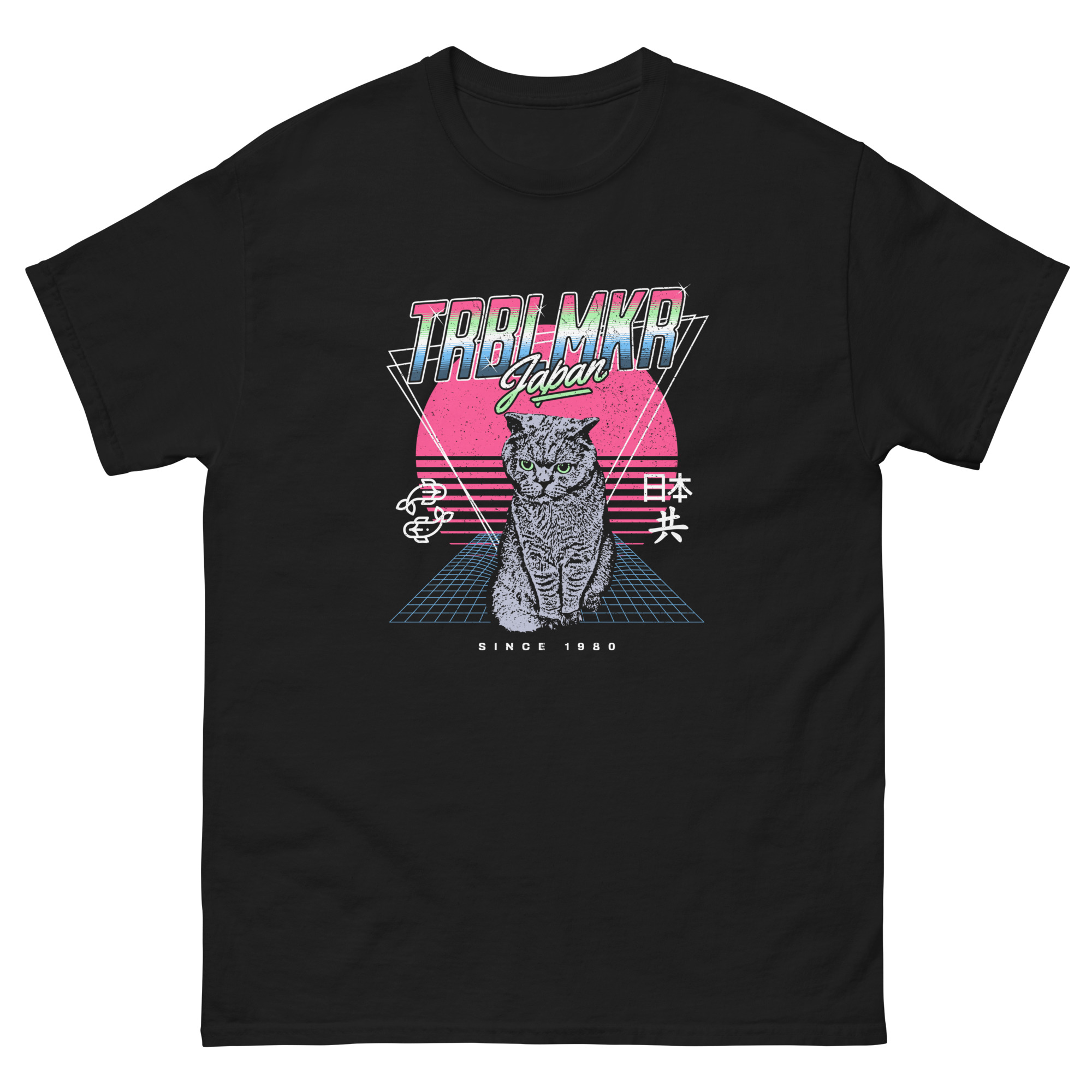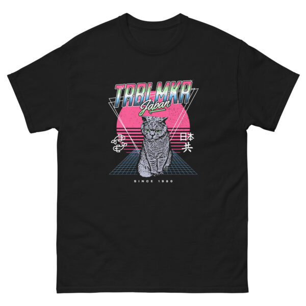 TRBL MKR = Trouble Maker. An 80s and Japanese inspired design featuring a “trouble maker” cat! This tee is perfect for retro and vintage tee fans who also love cats!